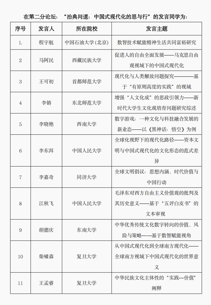 博士生罗仁杰、叶子维主持,共11位参会人员发言。论坛围绕中国式现代化的科学内涵、价值意蕴、具体实践等论题展开讨论,与会人员就相关话题展开交流探讨,成果丰硕。