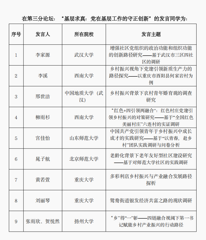 博士生郭帆、硕士生张永香主持,共9位参会代表发言。各参会代表聚焦乡村振兴、基层党建、新质生产力等热点议题,围绕所在队伍开展的主题社会实践进行分享,论坛气氛活跃,代表交流诚恳。