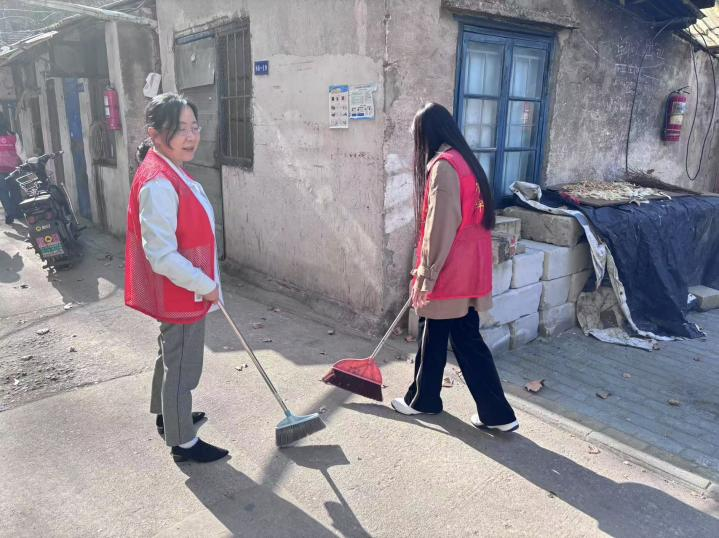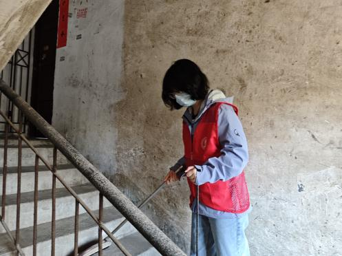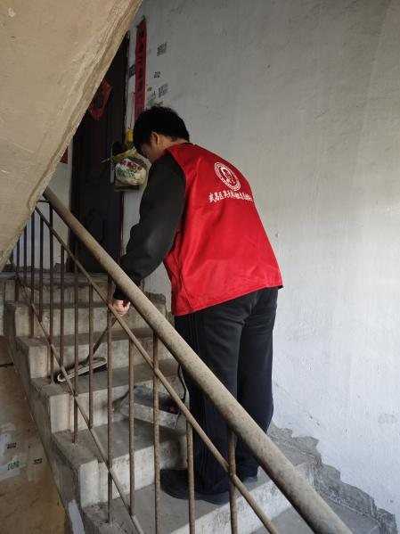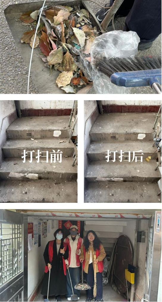理论学习结束后,进入了实践环节 —— 志愿打扫小区楼道。在梅隐寺社区工作人员的带领下,师生党员们迅速行动起来。大家手持扫帚、抹布等清洁工具,分工明确、配合默契,认真清扫楼道地面的灰尘和杂物。支部党员不怕脏、不怕累,主动清理角落里的垃圾,并积极向社区居民宣传环保知识,倡导大家共同爱护社区环境。在大家的共同努力下,原本杂乱的楼道变得干净整洁,焕然一新,获得社区居民的一致好评。