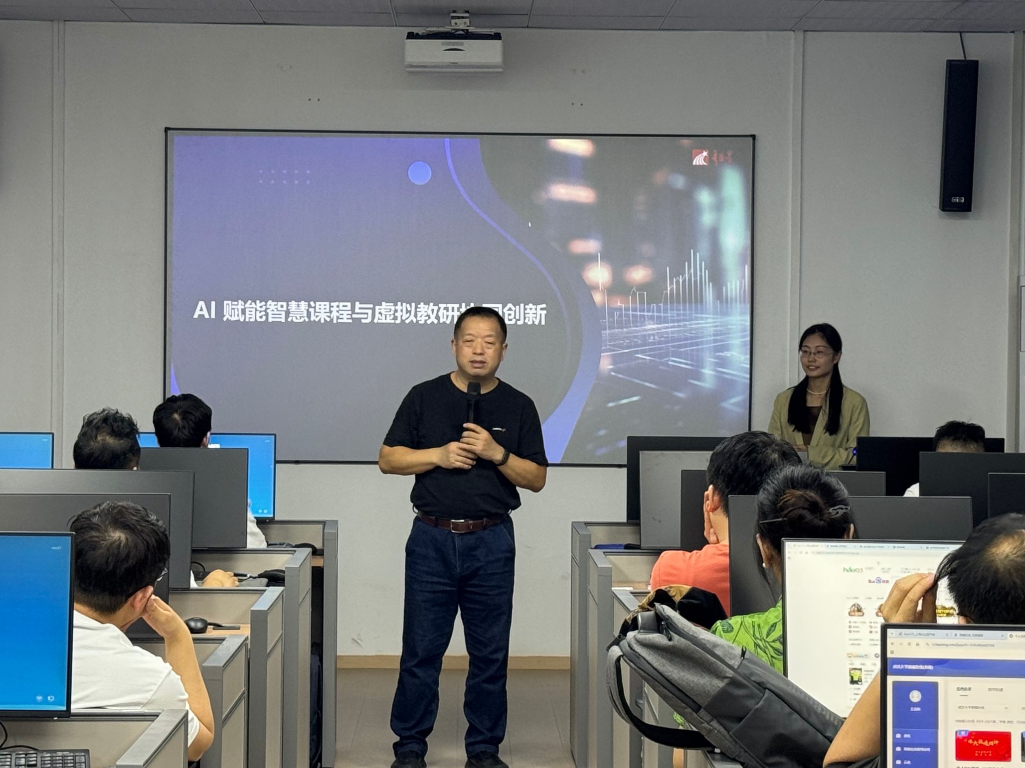 超星公司深入剖析了智慧课程的发展历程与未来趋势,对珞珈在线AI教辅功能进行了详细讲解,实操练习了超星平台AI智能备课助手提供的一站式备课服务, AI教案、AI课件和智能编写等工具快速生成教学参考资源,AI学情分析智能管理课堂、实时监控课堂、研判学生学习记录数据、学生异常行为等实用功能。