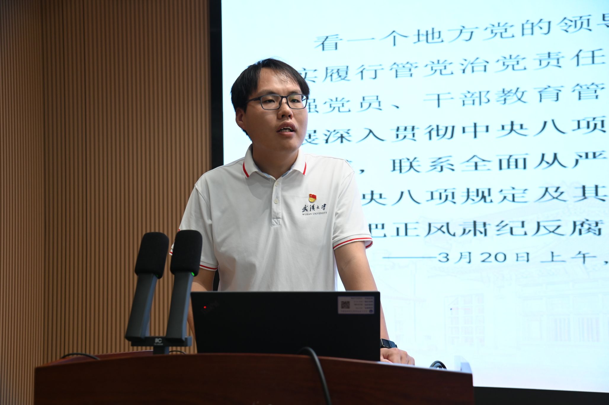 博士生宣讲团的张权以《风正好扬万里帆——全面把握中央八项规定精神》为主题,为党员们带来精彩的理论领学。他结合丰富的案例和详实的数据,从中央八项规定精神的历史发展、内涵意义以及在新时代的实践成果等多个方面展开阐述,让在场党员对中央八项规定精神有了更为全面和深入的理解,为大家上了一堂生动形象的微党课。