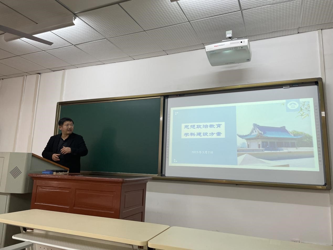 思想政治教育学科带头人项久雨教授作题为“思想政治教育学科建设方案”的主题报告,从学科建设口径、学科优势和学科劣势三个方面分析了学科发展现状,并提出学科建设思路与阶段目标、学科建设重点和举措。项久雨教授围绕深化党的二十大精神学习宣传贯彻、创新人才培养模式、提升学科研究水平、加强师资队伍队伍建设、优化完善课程体系、加强实习实训基地建设、加强图书资料建设等方面提出了学科建设目标,并进一步从修改完善人才培养方案、提升教师科研水平和能力、优化学术研究环境、加强重点课程建设、整体推进教学改革、建立健全学科建设规章制度体系、加强学生网络思想政治教育和进一步完善学科建设基础设施等八个方面提出了切实可行的学科建设举措。