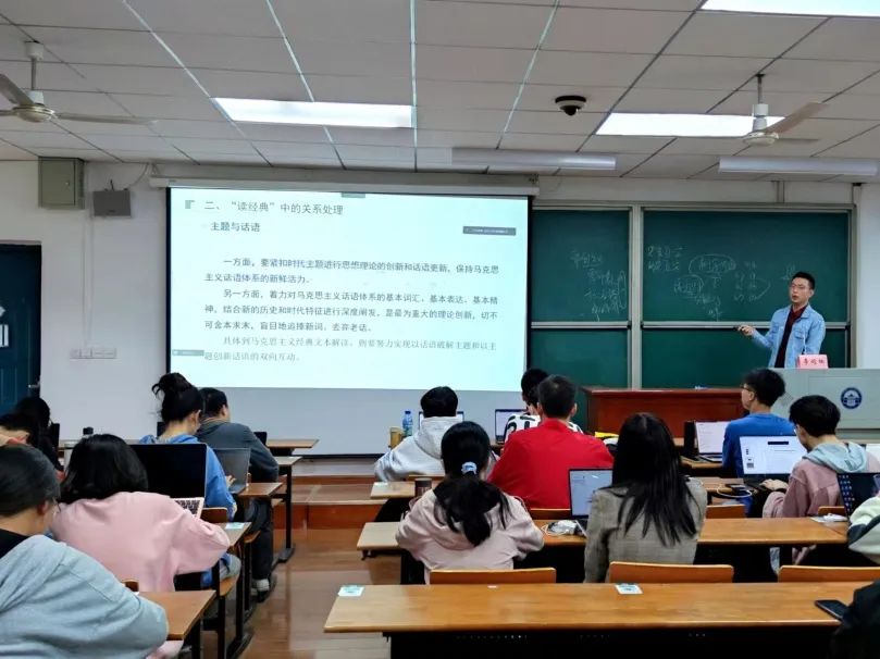 新进青年教师、南京大学哲学系博士李昀柏主讲,主题为“练好基本功——如何研读马克思主义经典著作”。讲座以线上线下同步的方式进行。马克思主义基本原理系杨军教授、周绍东教授、张萌博士、马克思主义理论专业2020级、2021级本科生及部分研究生到场学习。
