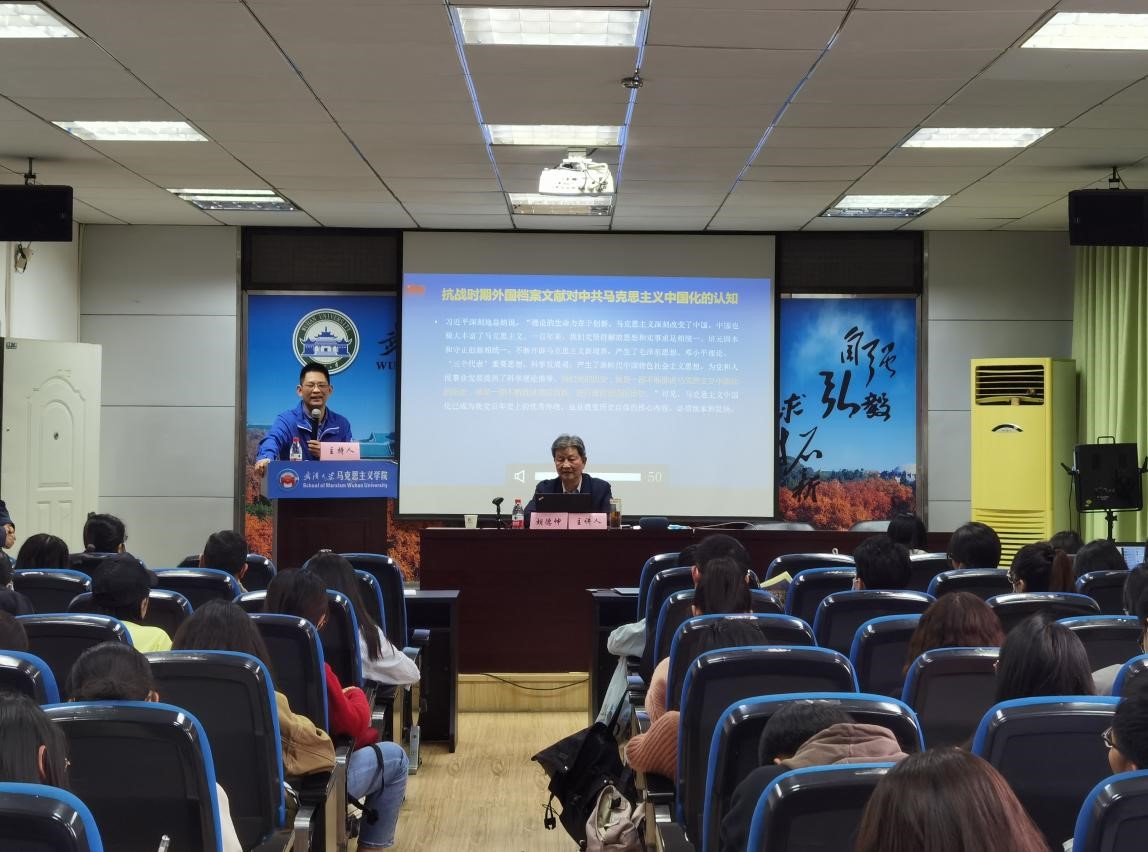接下来,学生们踊跃发言提问,胡德坤教授也一一耐心作了回答。他表明自己是研究世界史出身,尤其专注二战时期中国的抗战史。抗日战争的胜利是中国复兴的起点,应当重视对抗战史的系统学科建设。想要研究一门学科,须有世界视野,有大历史观,要用世界的眼光看中国,来研究中国在世界历史中的地位、作用,来研究中国共产党。自己和团队在世界各地收集资料的过程中,越来越发现中国共产党在二战时已有相当的存在感,因此他鼓励大家开拓视野,从更广阔的角度展开马学科研究。
