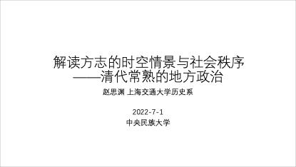 “第三届田野历史调查方法研习营”第五场讲座通过线上平台“腾讯会议”顺利举行。本次讲座由上海交通大学历史系副教授赵思渊老师主讲,由浙江大学历史系教授杜正贞老师担任主持人和对谈人,主题为“解读方志的时空情景与社会秩序——清代常熟的地方政治”。