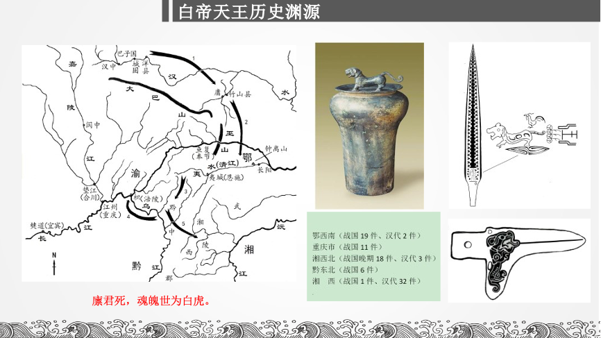 讲座的第二部分,主讲人对白帝天王历史渊源进行了回溯。巴国是先秦古国之一,其历史可追溯到商代,商至春秋中期,巴人活动于汉水中上游地区,史称汉上巴。春秋中前期,秦向东南而下,楚向西北而上,巴人活动范围受到挤压。公元前611年,庸国伐楚,楚联合秦、巴二国抗庸。庸灭,秦军北归,楚军南撤,巴国占据庸地,其后裔南下进入清江流域,巴国逐渐壮大。至春秋末期,巴人征服清江下游的樊、曋、相、郑四大氏族,五氏族结盟,共拥巴氏首领务相为五姓君主,奉其为“廪君”。此后,廪君带领五姓统一清江流域,建立以五姓联盟为基础的巴国,史称清江巴。公元前447年,巴国围楚伐鄾,战败,受楚国排挤,进入川东发展,史称东川巴。战国后期,川东巴国为秦所灭,部分廪君巴人流散至今天的湘西地区。