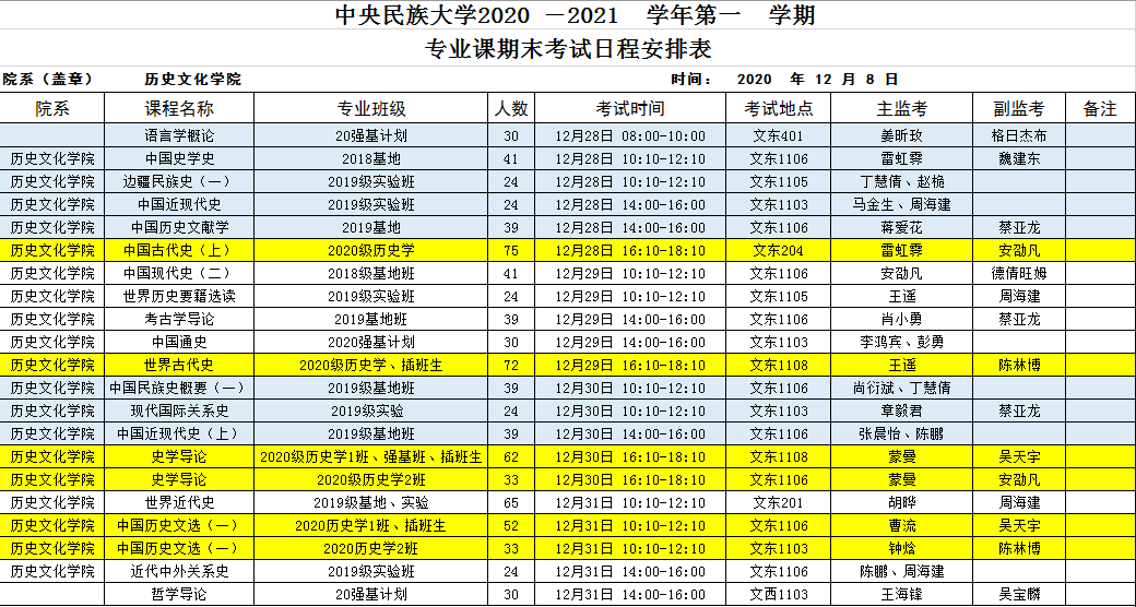 2020-2021-1学期期末考试安排