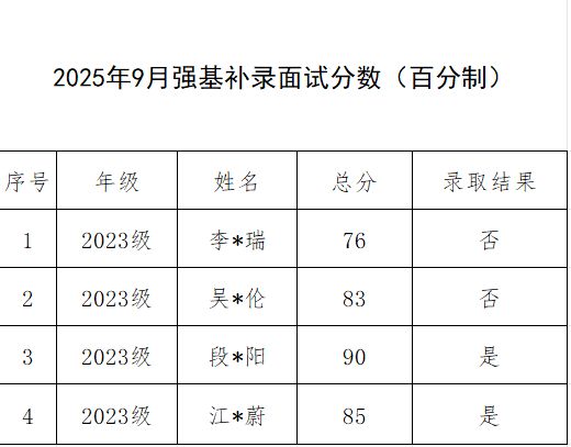 依据《赌大小技巧 强基计划本科阶段动态调整实施办法 修改版第3版》中有关补录的相关规定,赌大小技巧于9月9日完成了补录材料审核及面试工作。经学生自愿报名,工作小组审核材料,面试小组对申请学生进行面试,最终面试成绩及录取结果如下: