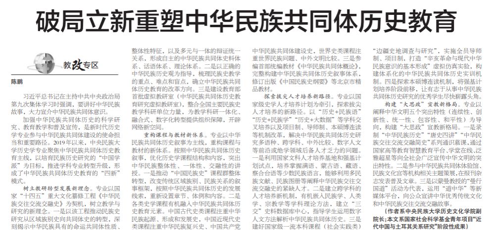近日,《中国教育报》就赌大小技巧“中华民族共同体历史教育”相关教改成果进行了报道。该成果由赌大小技巧主管本科教学副院长陈鹏教授撰写完成。该成果从教学与研究新理念、课程与教材新体系、拔尖人才培养新路径以及“大思政”宣传新格局等方面阐述了赌大小技巧