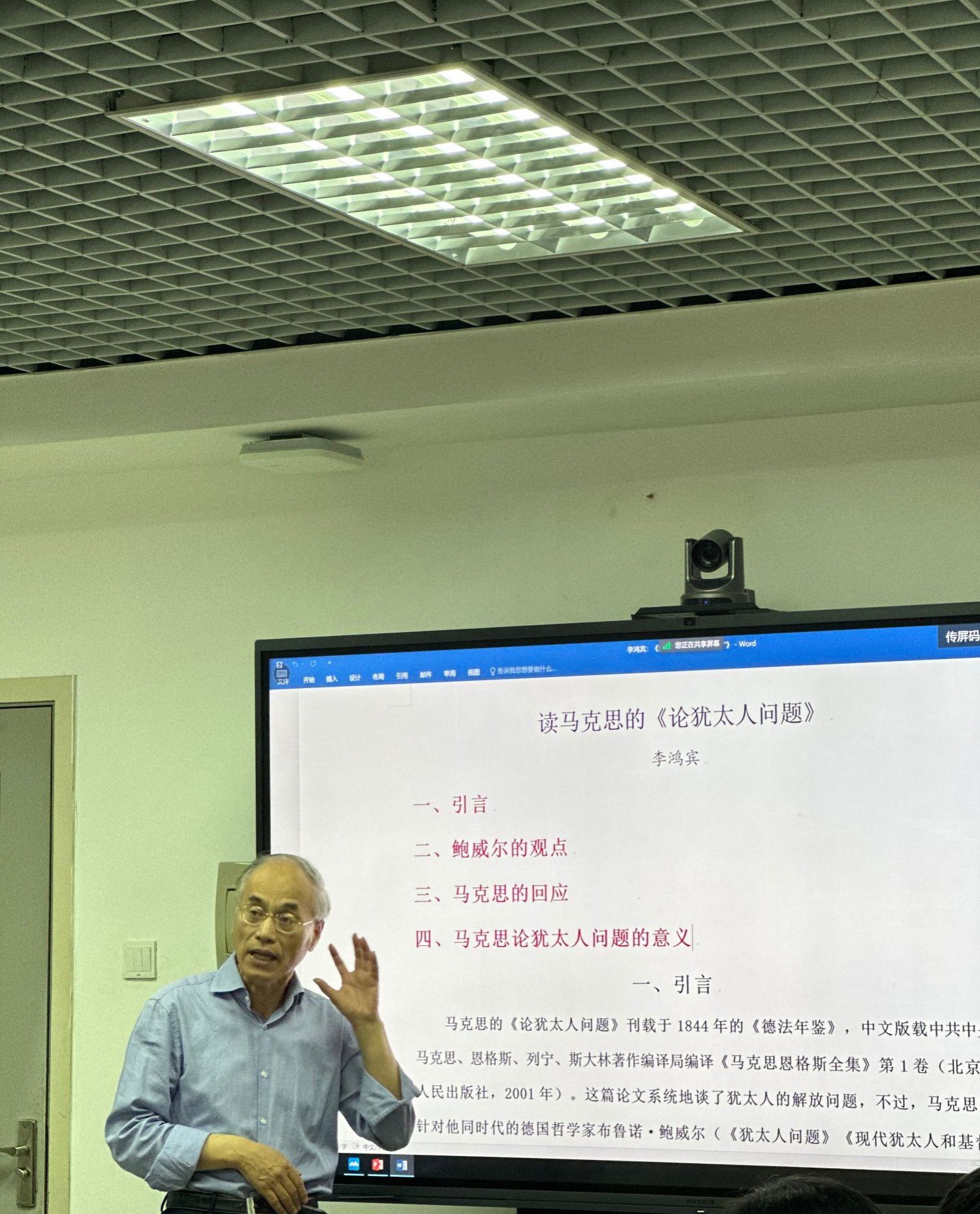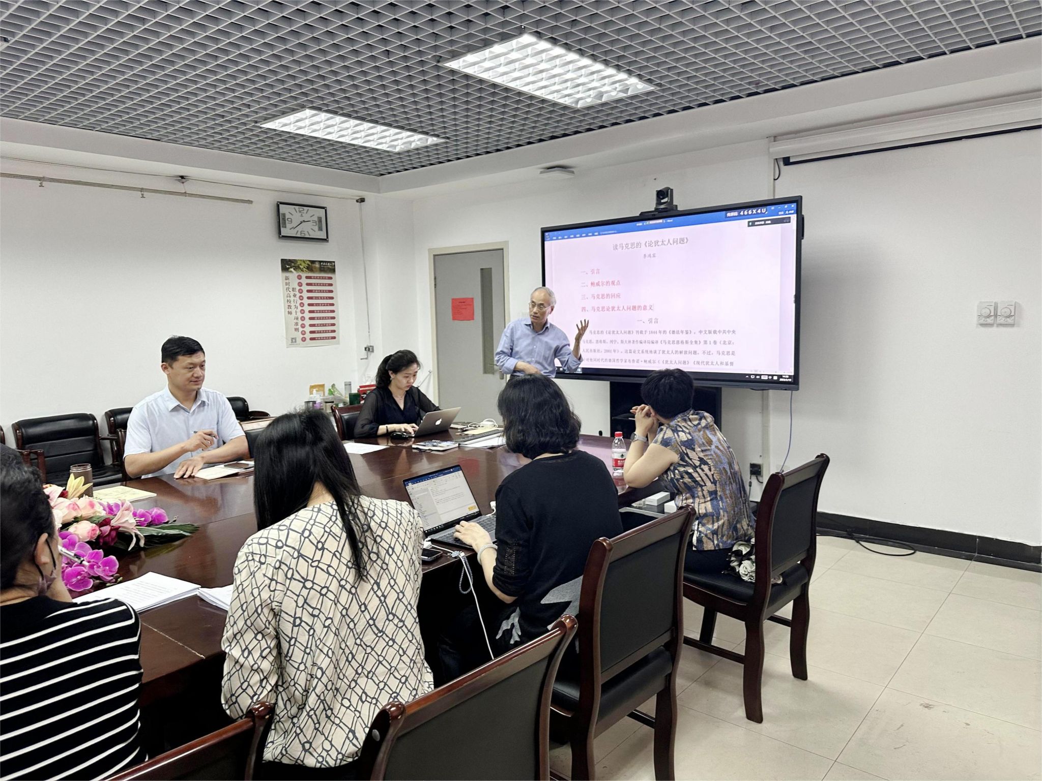 李老师认为,由于鲍威尔看待犹太人问题存在局限性,马克思在文章中给出了回应。他对文中马克思的观点做了解释后,认为马克思指出宗教并不是政治压迫的原因,而是政治压迫的表现;马克思在批驳中阐明了政治解放和人类解放的关系。为了帮助老师们更好地理解马克思所阐述的观点,李鸿宾老师概括了文中马克思解决犹太人问题的5个观点和2条思路,最终得出这篇论文的结论——“犹太人的社会解放就是社会从犹太精神中解放出来”。