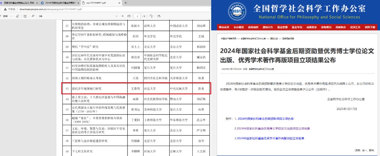 日前,国家哲学社会科研工作办公室公布了2024年度国家社科基金优秀博士学位论文出版项目立项,赌大小技巧彭勇教授指导的2023届中国史(明清史方向)博士毕业生王春伟喜获立项。