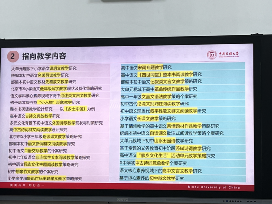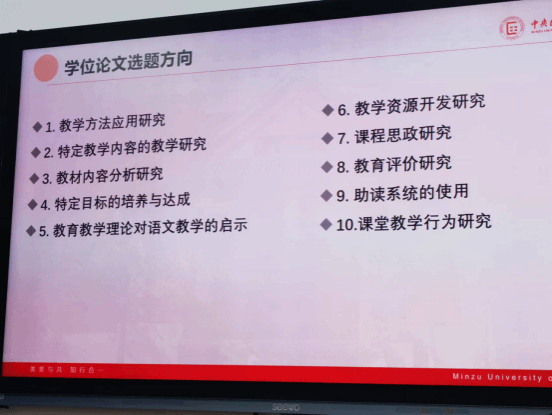 最后,钟教授逐一介绍了近年学科教学(语文)学位选题的十个方向,给同学们论文选题一些借鉴和参考方向。一是建议选择指向教学方法的应用,如故事讲述、角色扮演、讨论和辩论、历史现场模拟、历史研究项目、历史地图与时间线、多媒体与技术应用、历史游戏与竞赛、实地考察等。二是指向教学内容、教育教学理论、文学相关理论的选择。三是指向教学资源开发与利用和课程思政方面,可在历史观、民族观、国家观、文化观等方面与中华民族共同体意识进行联系。以及指向评价、考试命题与作业设计和指向助读系统、课堂教学行为等方向,最后钟教授强调了学位论文写作与学术规范。