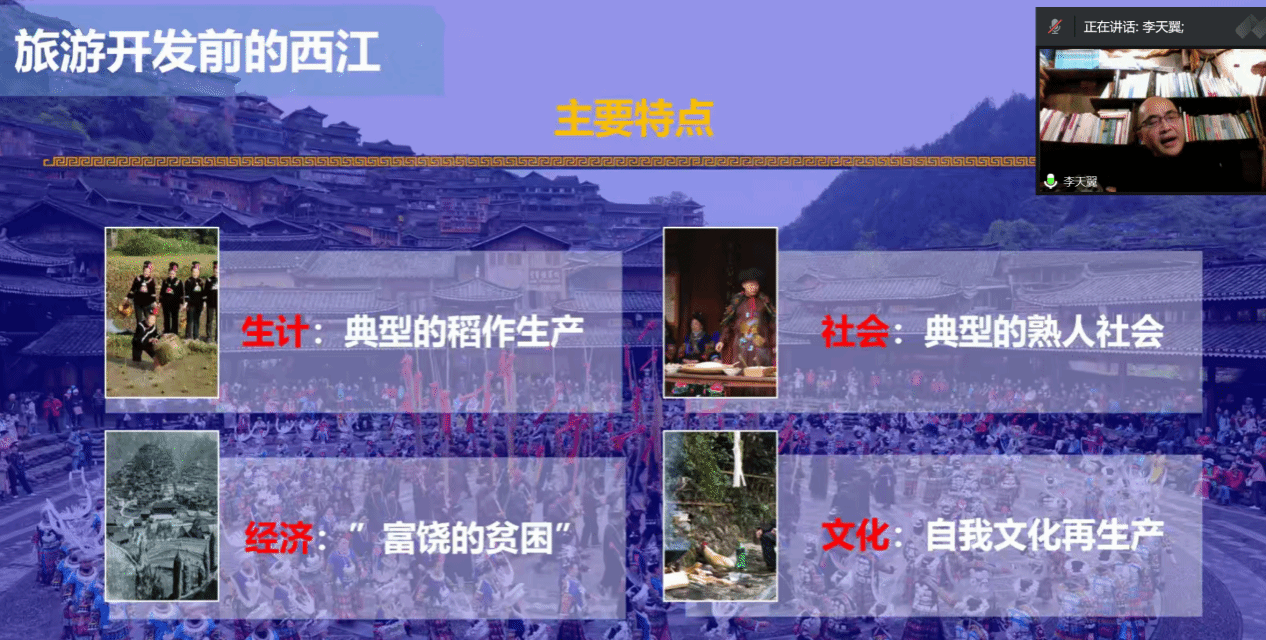 第二部分李教授围绕旅游开发前后的西江情况进行说明。对于西江的过去社会基本状况,李教授用“富饶的贫困”来形容。富饶体现在:西江文化丰富,拥有230多项非物质文化遗产,15项国家级非物质文化遗产。贫困主要体现在:业产量少、劳动力少、穿衣膳食结构单一、文化与外界交流困难,出现自我文化再生产的状态等问题。此外,李教授通过回忆小时候诸多故事,让听众更加切身体会到过去西江的贫困落后与李教授对故乡的真切情感。紧接着,他提到了2008年贵州旅游发展大会这一次巨大的转机,西江抓住机遇进行旅游开发,历经十多年的努力,造就了如今富饶、美丽、和谐、自信的良好发展景象。在近十年的发展中,过去在外务工的许多青壮年选择回到西江与当地百姓一起,为西江从稻作农业到旅游业的转变做出许多努力。渐渐地,西江人口破万,每年游客量保持在600万左右,成功打造了主客共享的旅游共同体社会。在旅游业的推动下,西江成功实现脱贫创富、产业振兴,而文化上也从自我再生产转换到与旅游再生产并存。