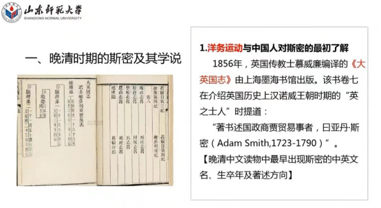 第二部分,张教授讲述了自己的选题缘由。第一是个人兴趣所在,并具备一定的前期研究基础。张教授在2016年以《亚当•斯密学说在近代中国的传播和影响研究》为题申请了国家社会科学基金项目并成功立项,此后几年关于亚当•斯密研究的成果较多。第二是将历史学研究与现实关注结合起来,做到经世致用。第三是前人关于亚当•斯密与中国关系的研究成果多集中于1949年以后,对1949年前的相关研究尚不充分。