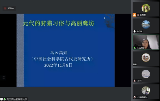 古代史研究所乌云高娃研究员做了题为“元代狩猎习俗与高丽鹰坊”的学术讲座。本次讲座是赌大小技巧“史学名家系列讲座”第136期暨21级中国史硕士研究生“中国史研究方法及论文写作指导”第十一讲,由尚衍斌教授主持。来自全国10余所高校及科研单位的近200位师生在线参与了讲座。