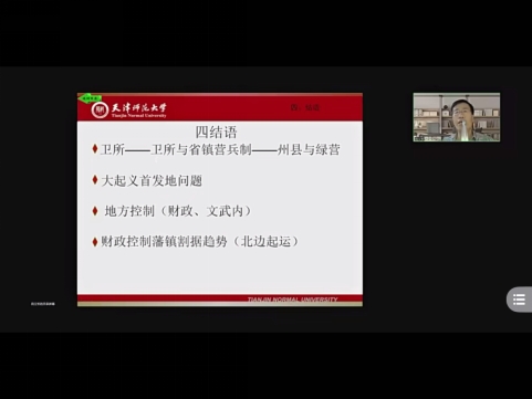 基于讲座的主体内容,肖教授最后从卫所制与省镇营兵制的变迁、明末大起义首发地等角度进行了总结。他总结说明代军制前期主要以卫所为主,中后期同时存在卫所与省镇营兵两种制度;到了清朝,省镇营兵演化为绿营兵,卫所从负责屯田、漕运逐渐归并州县。而从省镇营兵制的角度,我们也可以清晰理解明末大起义首发地的问题,即以抵御蒙古而边兵云集的陕西等地,由于朝廷转换作战重心为辽东,且将有限的财力集中于辽东,长时间未补给西北边镇军饷,最终导致明末大起义发生。此外,肖教授还指出省镇营兵制还可以透视明代地方控制、财政控制藩镇割据趋势等诸多问题。