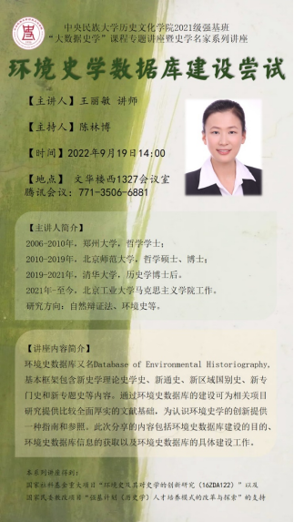 2021级强基班“大数据史学”课程专题讲座暨史学名家系列讲座《环境史学数据库建设尝试》以线上腾讯会议的方式举行。本次讲座由北京工业大学王丽敏老师主讲,本院陈林博老师主持。21级历史强基班、21级其他专业学生及部分外校师生参加了本次讲座。