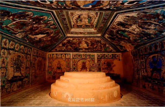榆林窟第39窟,方向东偏北 20°,建于唐代,沙州回鹘、元代、清代重修。主室偏后设中心柱,柱四面各开一圆券龛。本窟壁画几乎均经回鹘重绘,在敦煌石窟中堪称孤例,为敦煌石窟沙州回鹘洞窟之代表作品。
