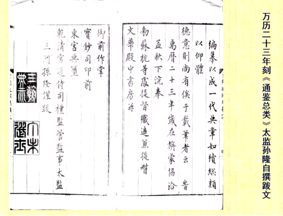 第一,万历二十三年司礼监管事太监孙隆为《通鉴总类》一书自撰的跋文。吴老师对跋文之末落款的两枚印章进行讲解,第一个“三朝典礼”,说明其在嘉靖、隆庆、万历年间任职于司礼监;第二个为“丁未选士”,此印章所表明的意思学界现在并没有形成统一意见。“丁未”为嘉靖二十六年,吴老师推测所谓“丁未选士”应该是指太监孙隆于嘉靖二十六年进宫这件事。“进宫”为什么也可以称为“选士”?从这个印章里面,我们可以看到明代宦官对于自己的认知。