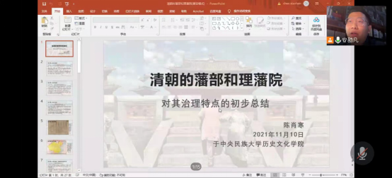 03:讲座的第三部分为“清代藩部的治理和理藩院”。陈肖寒博士由元明时期的地方行政制度引入,概述了地方治理制度的演变过程,简述了“藩部”和“理藩院”的形成过程以及相关职能。