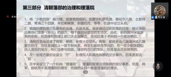 04:讲座的第四部分为“藩部的性质”。陈肖寒博士在本部分具体讲解了藩部在地方治理和对外关系等方面发挥的作用,厘清了清朝中央政府与藩部之间的关系。