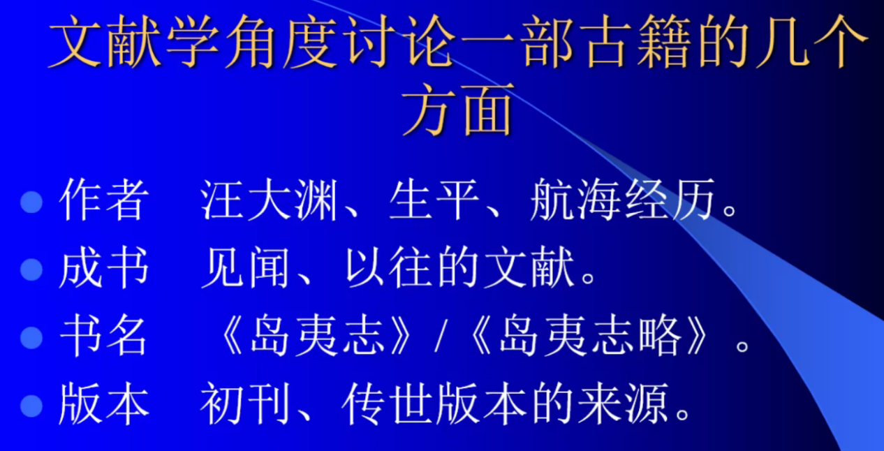 第四部分,版本问题。《岛夷志略》于至正十年初刊,今本来源于明代嘉靖时期袁表的抄本。杨老师通过文献对比,发现明代诸书所引《岛夷志》与今本《岛夷志略》几乎完全一样,可见今本基本保存了汪大渊《岛夷志》原貌。
