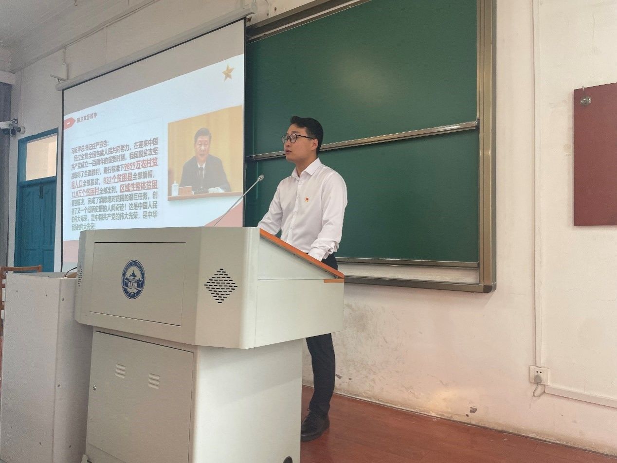 2017年经济与管理学院的毕业生,2018年参加脱贫攻坚驻村工作。他以“弘扬爱国守边精神,做神圣国土的守护者、幸福家园的建设者”为主题,在两个课堂上作了分享。他重点阐述了特别能吃苦、特别能战斗、特别能忍耐、特别能团结、特别能奉献的“老西藏精神”,并援引张国华将军、优秀共产党员孔繁森和山南隆子县玉麦乡的桑杰曲巴和卓嘎、央宗父女三人几十年如一日放牧守边等的感人事迹,动情说道:“在高原上工作,最稀缺的是氧气,最宝贵的是精神。”同学们也深受感染。