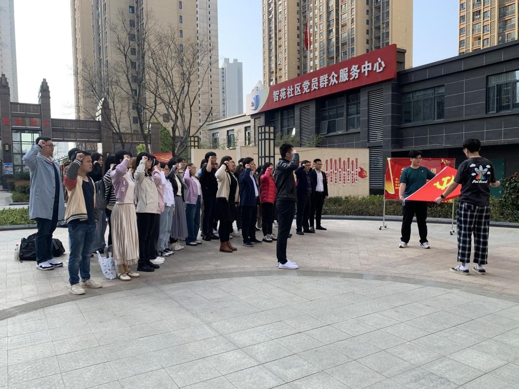 活动最后,马院师生和智苑社区的工作人员们一起来到习近平总书记曾与居民亲切交谈的社区广场,面向党旗,举起右手,庄严宣誓,铮铮誓词,声声入耳。师生们也必将践行入党誓词,坚定信念,奋勇前行。