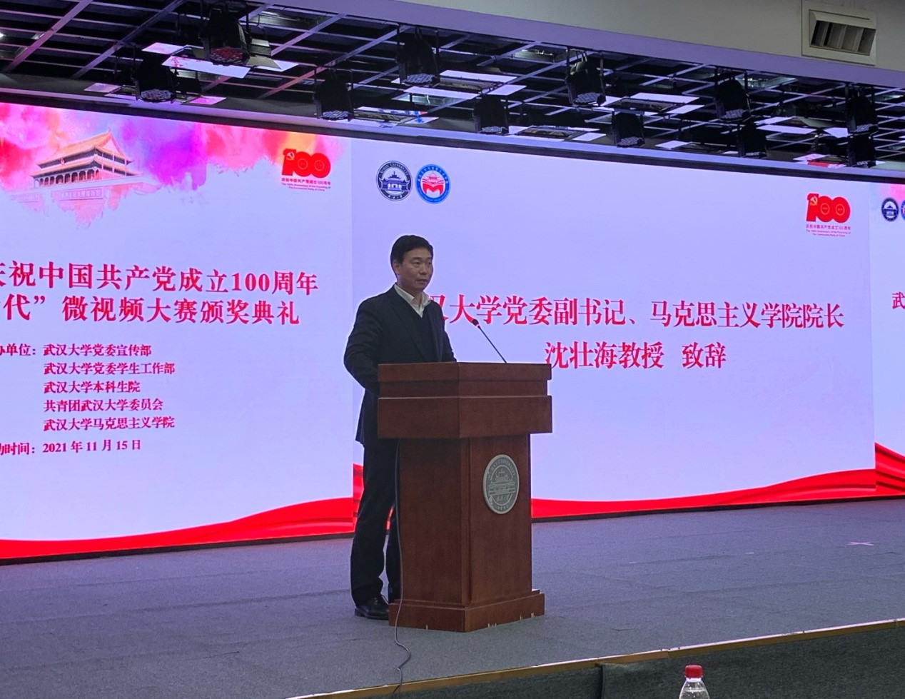 大赛颁奖典礼在响亮的国歌声中缓缓拉开帷幕。沈壮海教授向活动的顺利举行表示祝贺,认为大赛的举办具有特别的意义:第一,微视频大赛是思政课教学改革的持续探索,旨在激发学生学习的主体性,同学们在构思、制作微视频的过程中成为“剧作者”、“剧中人”,成为党的思想理论和百年奋斗的讲述者,这是对思想政治理论课教学改革的一种积极探索和创新。第二,微视频大赛是对思政课教学成效的一种特别检验,既检验老师教的成效,也检验同学们学的成效;老师和同学们同时成为“命题人”,也共同担当“阅卷者”。第三,微视频大赛是一次集中展示,展示的是青年大学生心中我们党的百年奋斗史、我们的民族走向复兴的宏伟进程及光辉前景,展示的是同学们对新时代党和国家事业取得的历史性成就、发生的历史性变革的认识和理解,是同学们的青春自信和担当自觉。丁俊萍教授代表“概论”课程中心介绍了有关评审情况,罗永宽教授宣读了获奖作品名单。